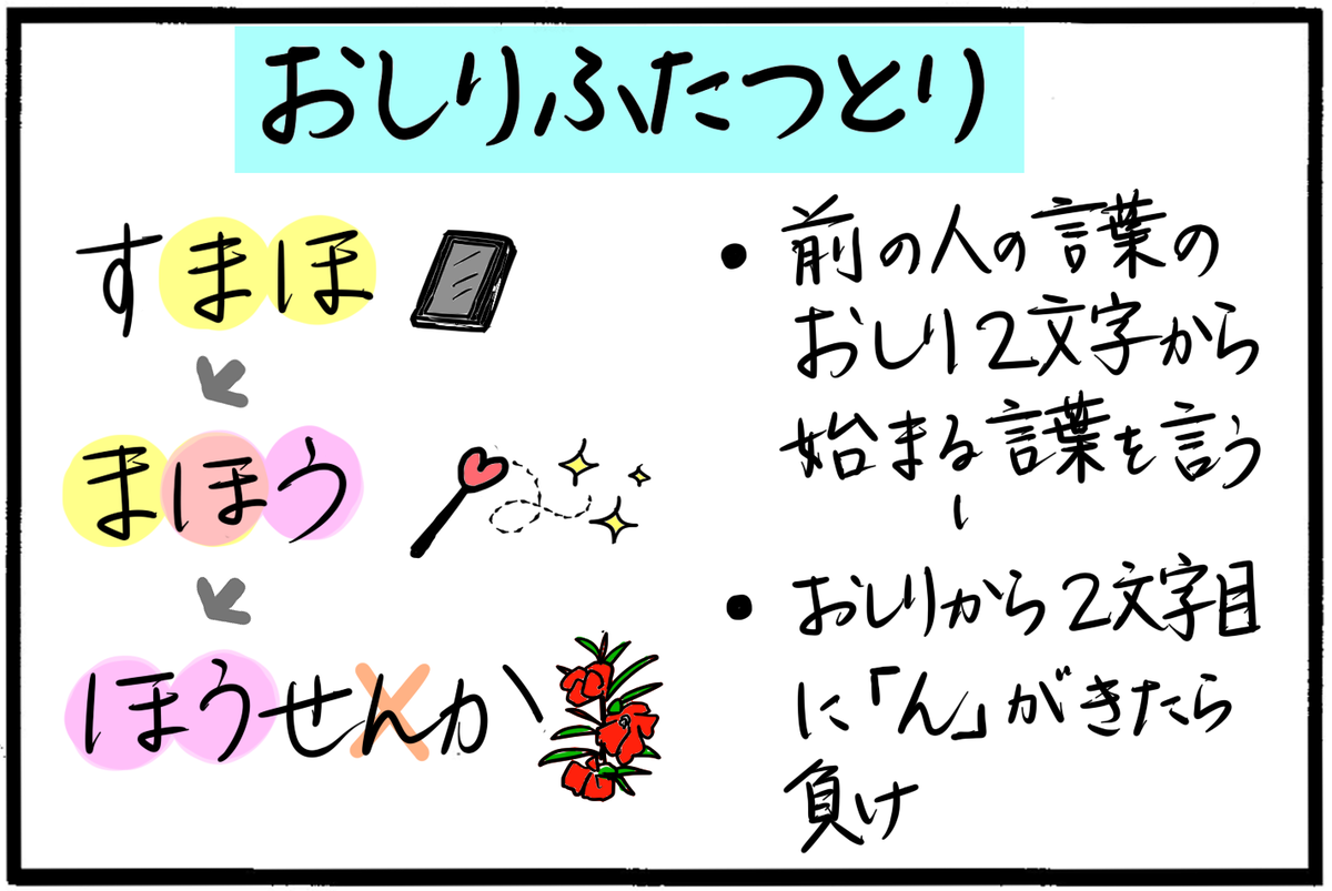 3文字しりとり 「2文字つなぎ」しりとり たべものしりとり テーマしりとり しりとりでつなごう① しりとりでつなごう② しりとりでつなごう③ だんだんしりとり スーパーしりとり① 「 ん」ことば 2文字しりとり ① 基本的なルールはほとんど変わりませんが『最後から2文字を、次につなげる』というルールを加えます。 通常のしりとりは最後の1文字だけで次は始めますが、追加